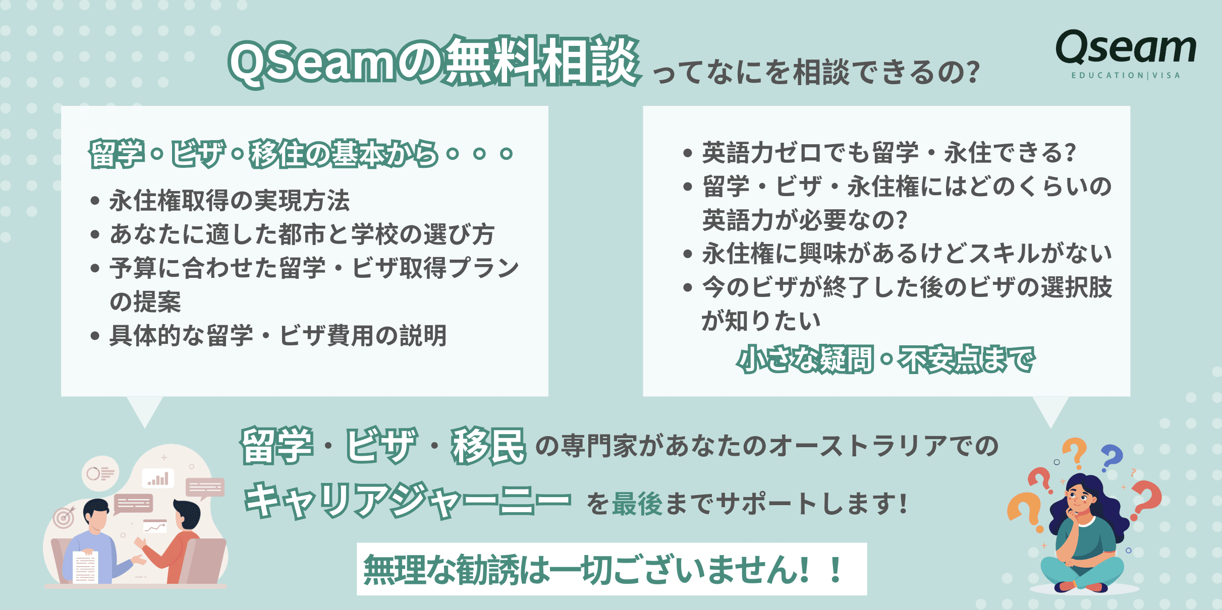 A:QSeamの強みは移民弁護士が在籍していることです。ですので、留学のサポート以外にもビザの申請や永住権取得のサポートも弊社で全て行うことができます。QSeamはあなたのオーストラリアでの夢実現にむけて最後まで一緒です。