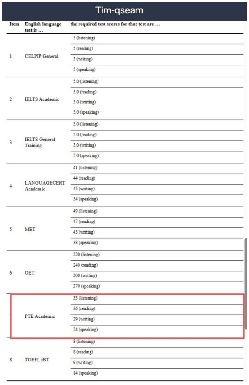 元々PTEは全てのセクションにおいて36スコアを取る必要がありました。しかし、9月13日からListenig 33, Reading 36, Writing 29, Speaking 24に変更になりました。そのほかの英語テスト(例えばIELTS)の情報は下記の画像からご確認ください。
